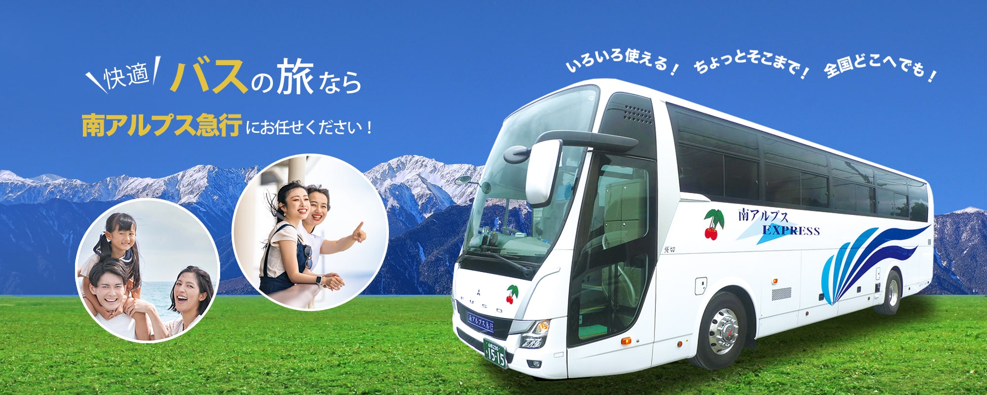 大人数での団体旅行をはじめ、社員旅行、観光旅行、家族旅行、冠婚葬祭、スポーツ観戦、空港送迎など、幅広い用途で、お気軽にご利用ください。ご利用人数や目的に合わせ、小型バスから大型バスまでご用意いたします。車載設備はテレビ・カラオケ・冷蔵庫・DVD・湯沸かしポットを完備。サロンバス対応で楽しいバス旅をお届けします。観光バスなら山梨南アルプス市の南アルプス急行にお任せください。