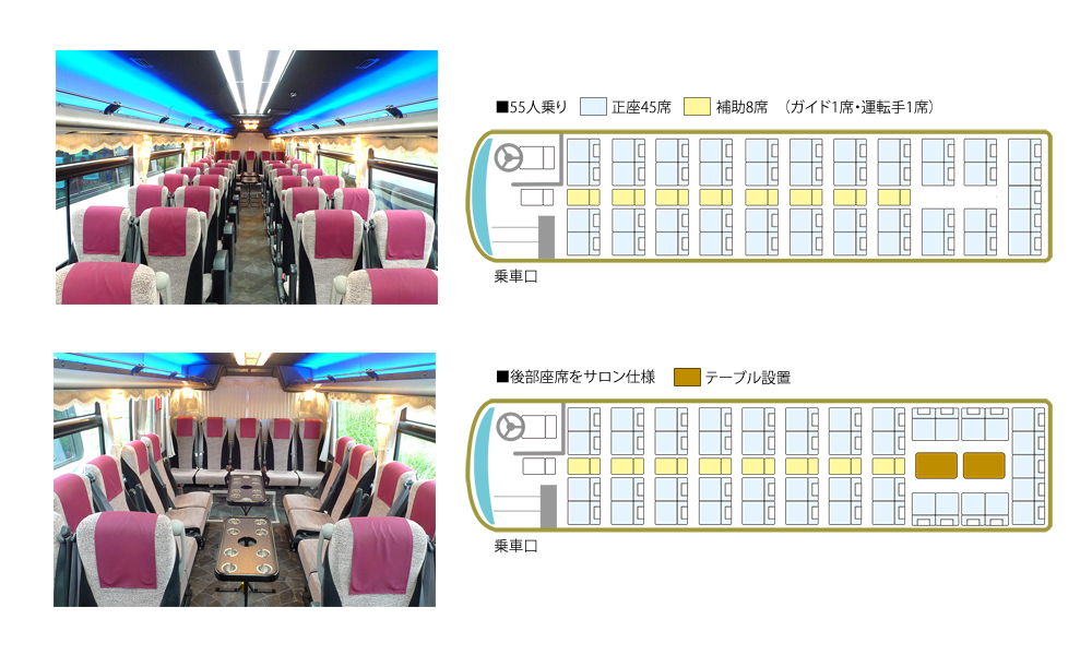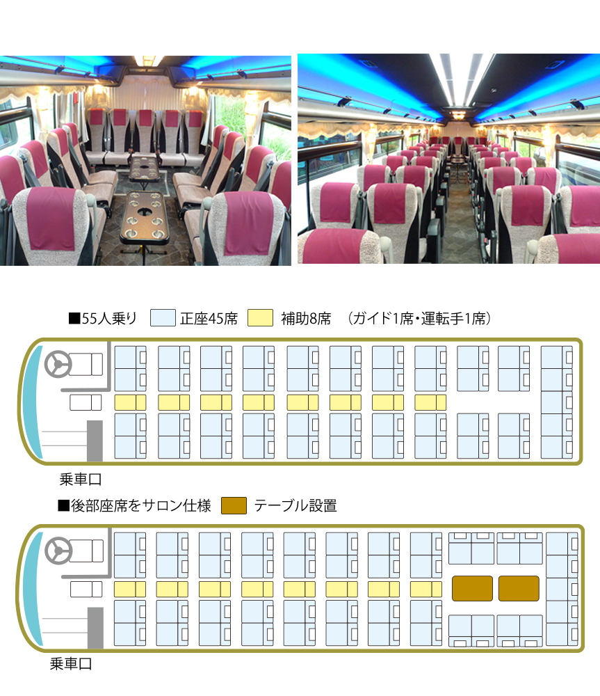 大型・中型・小型それぞれが『サロン仕様』に変更できます。宴会をしながらゆったり快適な旅をご提供します。(写真は大型バスです)画像クリックで大きくなります