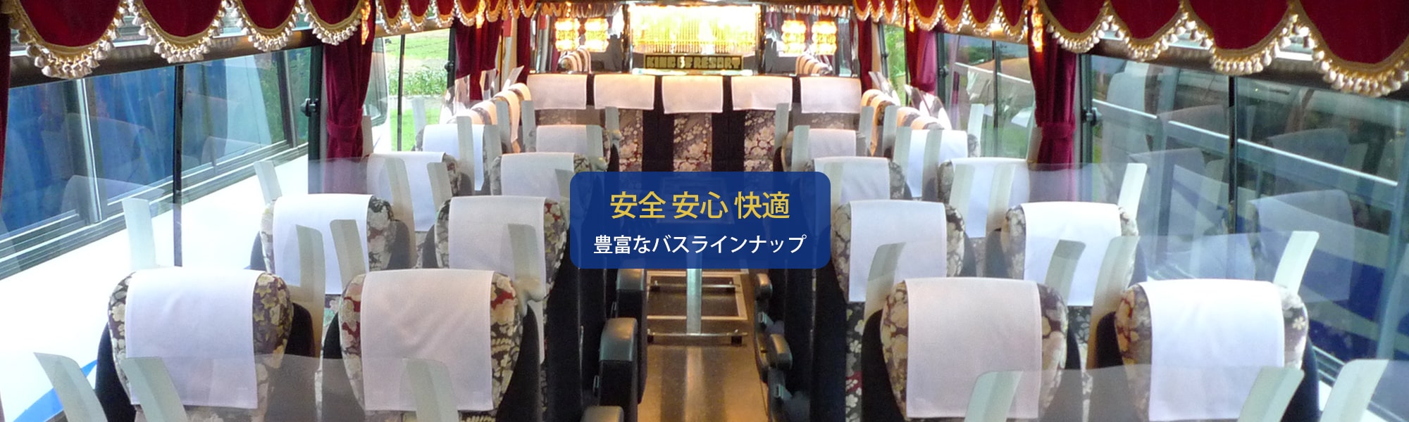 ご利用人数や目的に合わせて小型バスから大型バスまで『12台』をご用意しています。車載設備はテレビ・カラオケ・冷蔵庫など完備。サロン仕様にもできますので、快適な空間で移動できます。