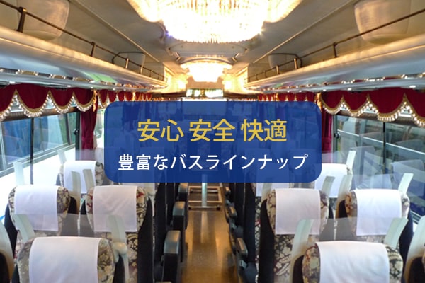 ご利用人数や目的に合わせ、小型バスから大型バスまで『12台』をご用意しています。車載設備はテレビ・カラオケ・冷蔵庫など完備。サロン仕様にもできますので快適な空間で移動できます。